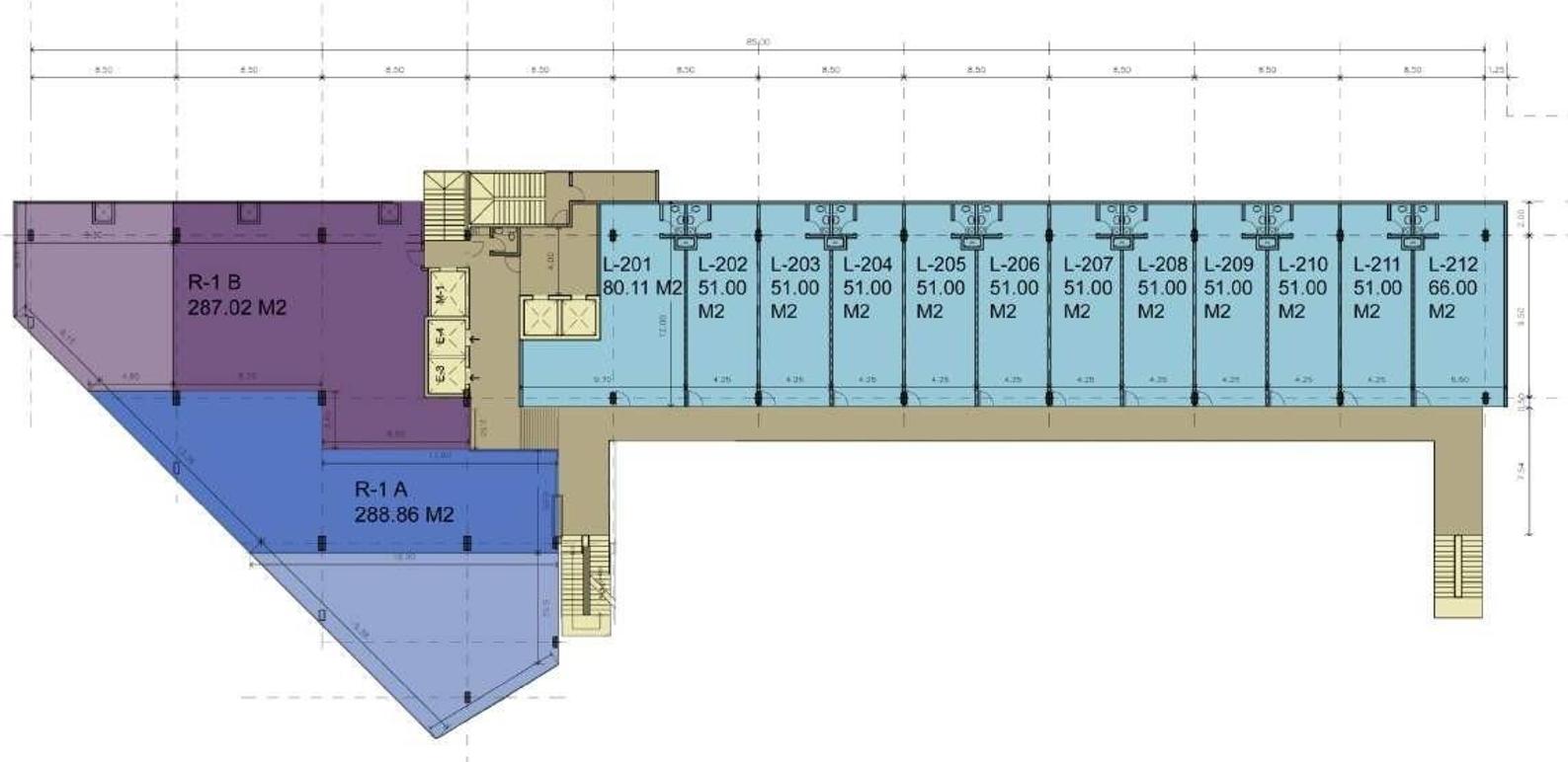 Retail spaces ranging from 51 to 401 m2 with outdoor and indoor basement parking.