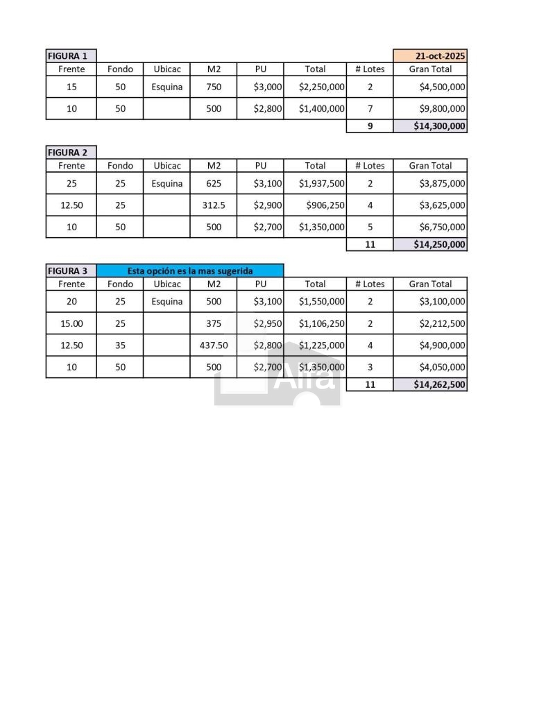 2) Comercializar el Terreno con una Sub División, esto es obtener 11 lotes para que cada lote se venda ya individualmente y esto incrementaría el valor de venta a digamos 13, 500, 000 o 14,262,500. Que consideraciones se deben tener para esto (Costo para hacer la Sub División) + (El porcentaje máximo de ISR por la venta de un inmueble en México puede llegar hasta el 35% sobre la ganancia obtenida (la diferencia entre el valor de adquisición y el valor de venta, ajustada por inflación, mejoras y gastos de venta), (Las Comisiones por venta Facturadas pueden apoyar para minimizar la base grabable en este caso es el 6% del valor de Venta mas IVA)